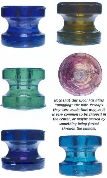 certainty that these early finds in the hobby are unembossed spools made by Zicme. The milkglass spool is an especially rare