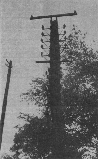 eight crossarms with the insulators. Wood of any kind was rare at that time. The