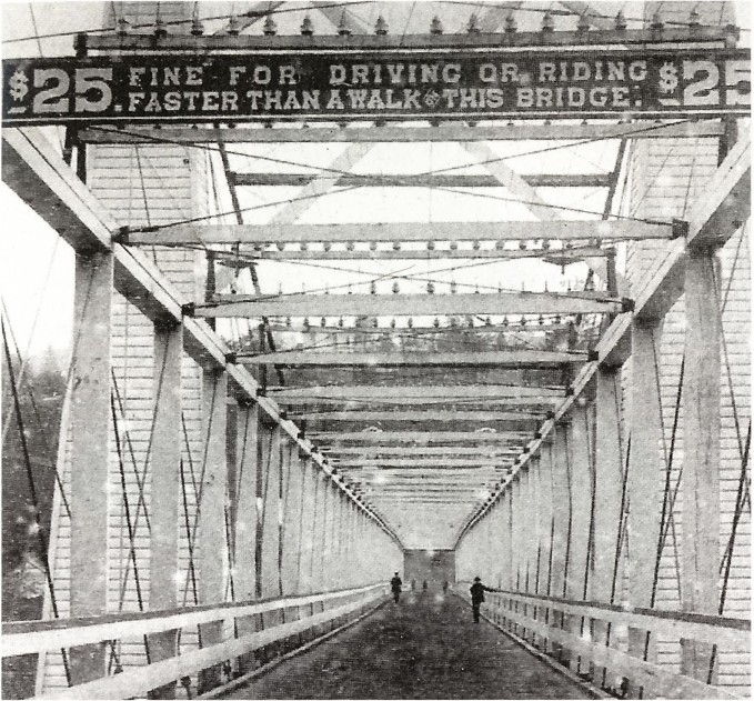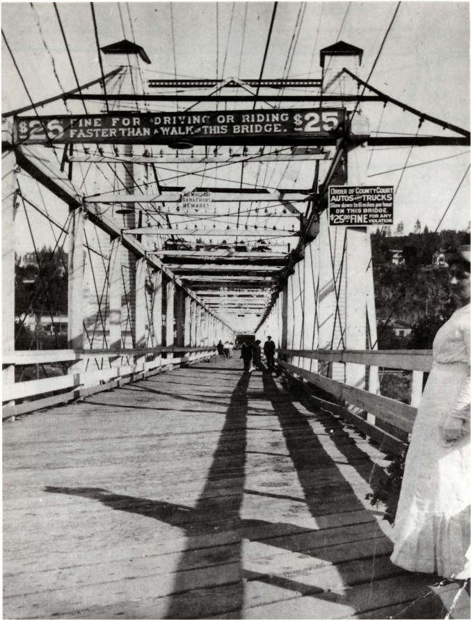 Oregon City Bridge - 1889. Shown above is Mike Parker's picture of the bridge over the Willamette River, which he believes was taken in 1889. While the quality of this print isn't as good as the picture taken in the early 1900's (shown on page 23), note that virtually every insulator above the sign looks like it could be a Fluid or a Liquid.
