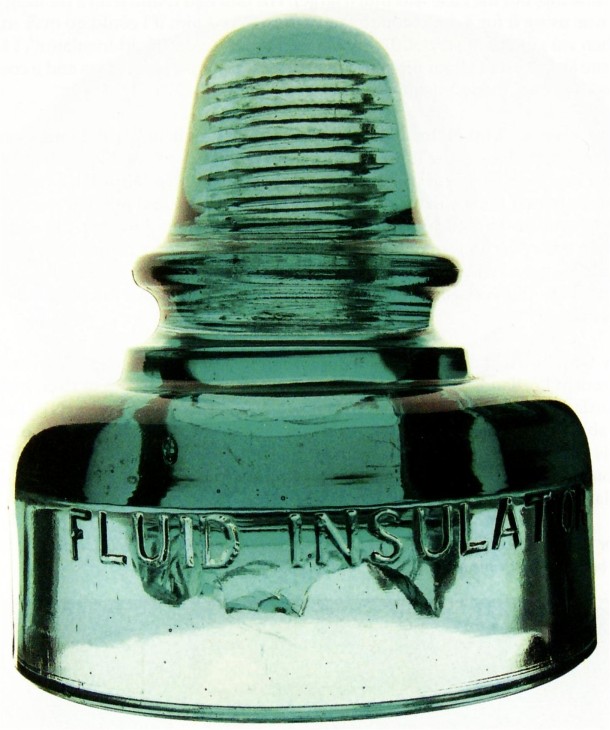 "The Fluid Insulators are especially designed to prevent surface leakage, and to give an insulator many hundred times higher than that obtained from the ordinary forms of glass insulators now in use. An insulating fluid, which is not sufficiently dense to support even a film of dust or moisture, is placed in a recess formed in the glass, and well protected from the weather. In this way a fluid surface, which is always clean and highly insulating, even in the dampest weather, is interposed between "line" and "earth." It can be readily observed that, although the first outlay for these insulators may be greater than that for ordinary glass insulators, the subsequent saving in running expenses and the avoidance of trouble will more than repay first expenses within a very short time.