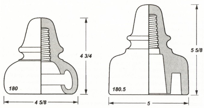 Threaded Pin Type Scale Drawings: Shown below are the CD drawings as assigned by N.R. Woodward and pictured in McDougald's Price Guide. Note that the Fluid (right) is a somewhat larger insulator than the Liquid (left).