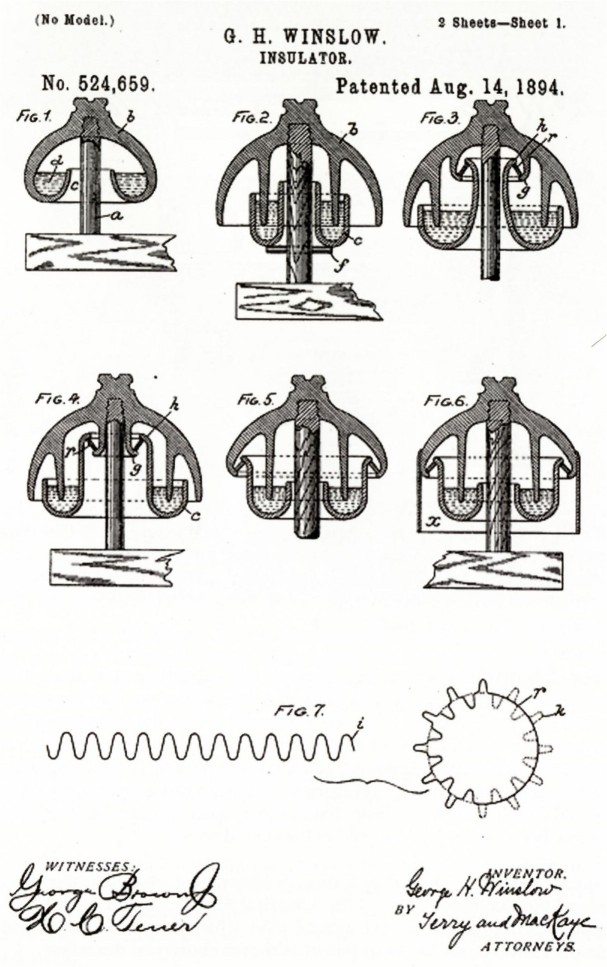 How do you explain the Winslow patent being issued perhaps as much as five years after Fluids & Liquids were in production? Could we speculate that Winslow didn't pay his patent attorney in a timely manner? Or perhaps several years went by before someone noticed that the concept wasn't covered by a US patent? Does that explain Winslow's shotgun approach showing six different figures for how the insulator could be designed?