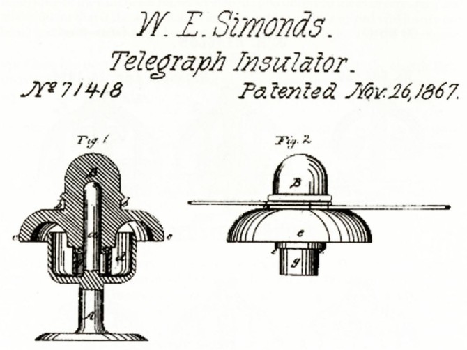 W. C. Johnson & S. E. Phillips received a patent on March 26, 1878 for an insulator with an oil basin. Their patent had applications for insulators used both above and below the crossarm. Their patent was intended as an "insulator for telegraph wires", rather than for the transmission of electrical power. No doubt the 1867 Simonds patent was intended for telegraph use also.