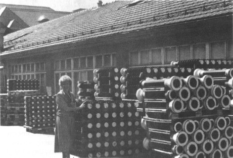 Marilyn standing by post insulators ready for shipment at Langenthal plant