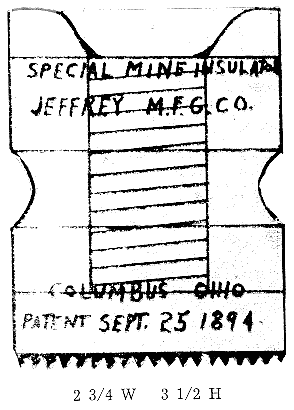The collectors item is the very scarce JEFFREY MINE INSULATOR. Embossed: SPECIAL MINE INSULATOR / JEFFREY MFG. CO. /COLUMBUS OHIO/ PATENT SEPT. 25, 1894, this insulator is one of the rarest and most sought after of all threaded insulators.