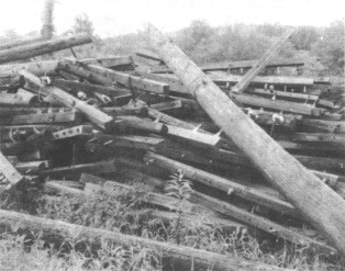 the field were piles of poles and crossarms (Farmers buy them for fencing).