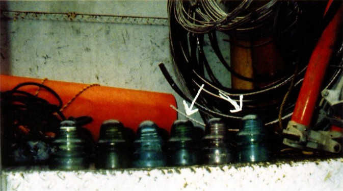 voltage lines) with porcelain unipart insulators. He used the drill on the