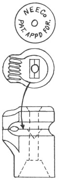 / N.E.E. CO. / 250V 50CP. This fits patent #864,427 of Harry W. Lawrence,