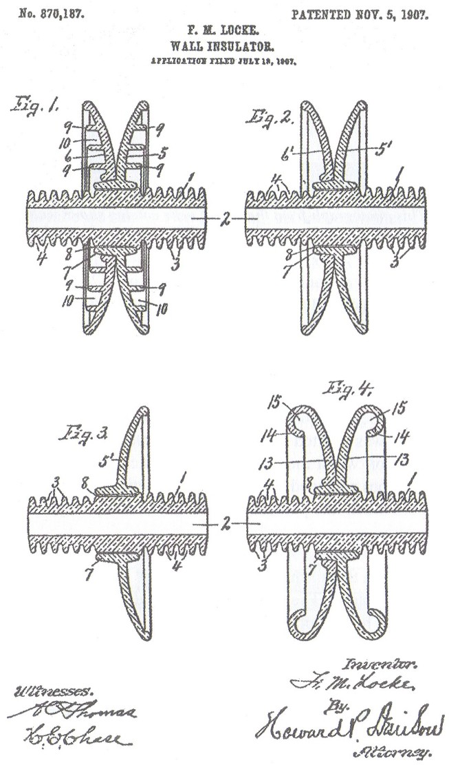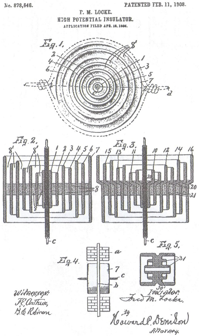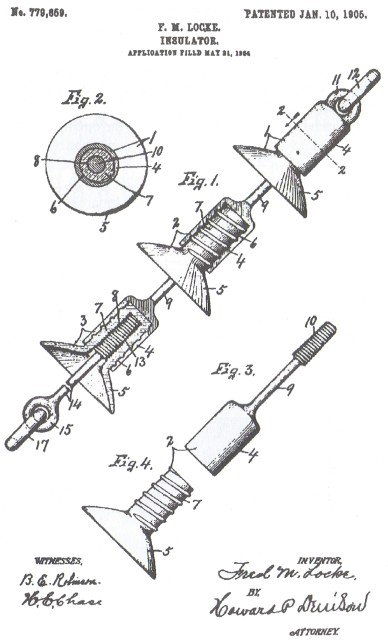 or two porcelain disks in the center. Fred Locke's second patent, No. 878,646,