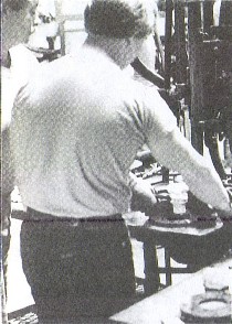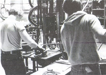 With his left hand, the presser takes the embossing ring from a hot plate and