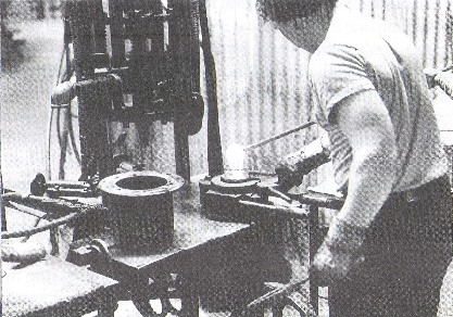 the molten glass begins to drop towards the waiting mould. The PRESSER takes