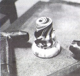milkglass and then dropped as a pre-swirled gob of molten glass into the mould