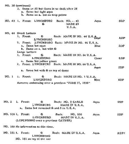In "INSULATORS - Crown Jewels of the Wire", April 1970, page 16, Mr. Woodward gives a complete listing of the actual production at the Lynchburg plant. His list contains several not on my list. Mr. Woodward goes on to say that not all the styles mentioned have been found with Lynchburg embossing. It is quite likely that some insulators embossed GAYNER were manufactured at the Lynchburg plant. The list of insulators includes a NO. 180 style. I know nothing at all of this variety save that it has been reported to exist and that Mr. Woodward has verified its existence. I list it only for completeness.