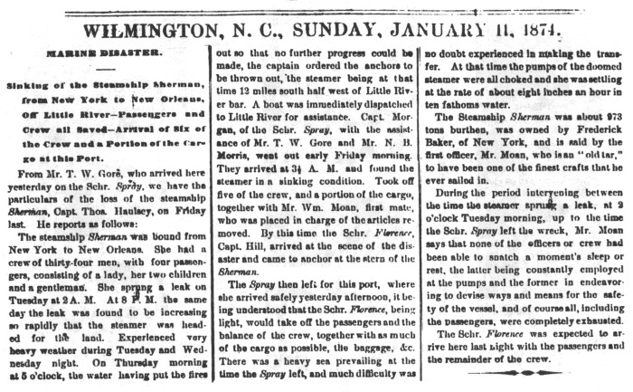 WILMINGTON, N.C. Jan. 11 -- The Steamship Sherman from New York for New Orleans sprung a leak on the 6th