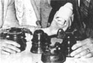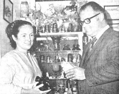 DISPLAYING two of the more than 75 different types of wire insulators in their collection, Mr. and Mrs. Peter