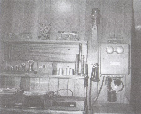 collectibles in her home -- a telegraph key, crank wall phone, brass weights for