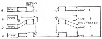 This circuit operates as follows: Phones A and D use both wires to transmit
