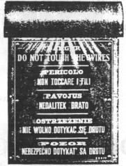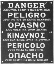 | This sign reads "DANGER - DO NOT TOUCH THE WIRES" in English,