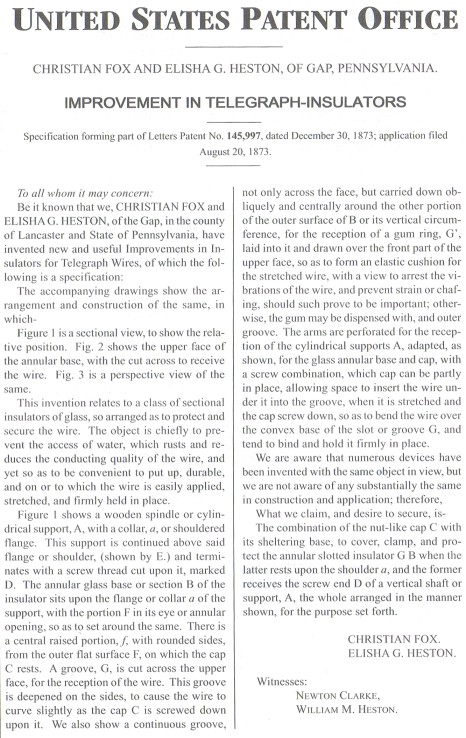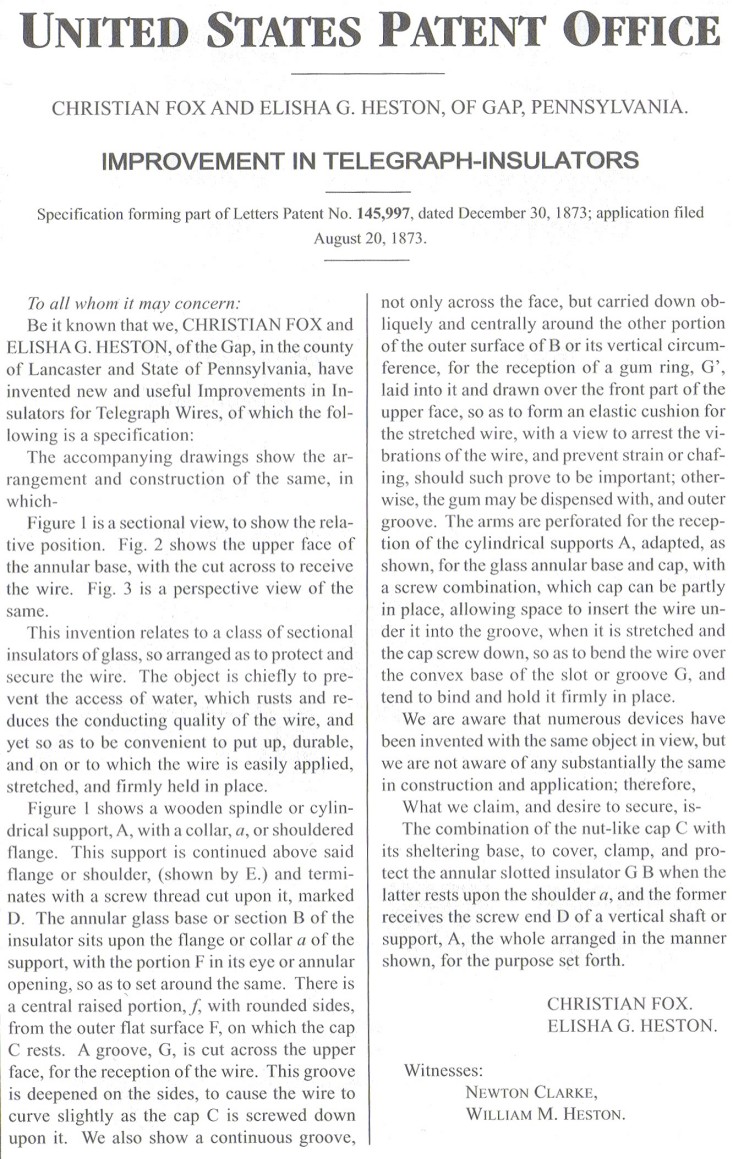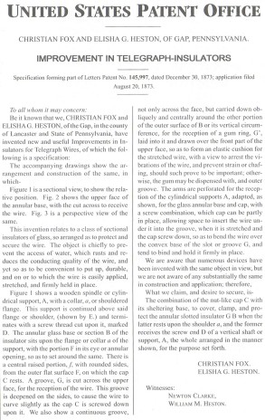 COVER: Fox and Heston Insulator Patent Model.