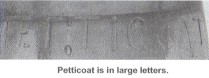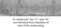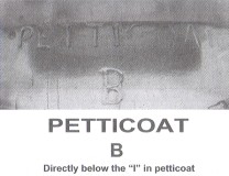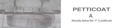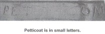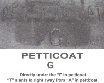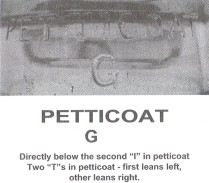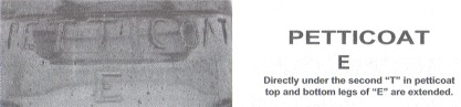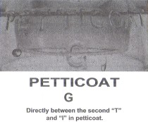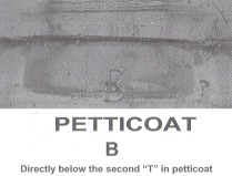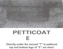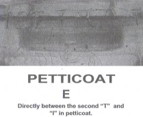 Directly under the second "T" in petticoat, top and bottom of "E" are
