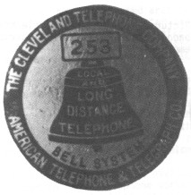 Two pre-Ohio Bell badges are marked Cleveland Telephone Company (#253) and