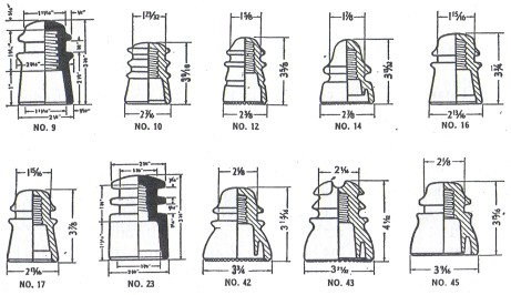 insofar as I know, has been made only in clear glass. These two styles are Western Union dead-end shackle insulators and were used with a clevis