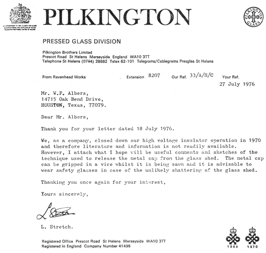 insulators made for use on high voltage lines by Pilkington Brothers in England.