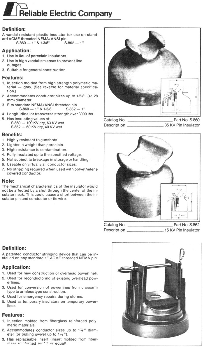 Hendrix insulators last month can be said of these Reliable pin types. They are