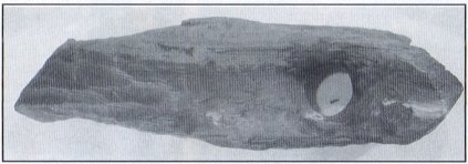 Above, view showing holes carved through the wood at opposite angles. Below,