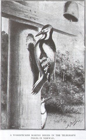 of California are much wiser; these birds use the telegraph-posts of red cedar-wood as store-houses. They make holes in the posts at the top, and fill