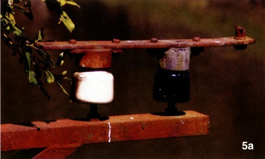 A pair of these very unusual, iron top insulators were cut off an inside wall