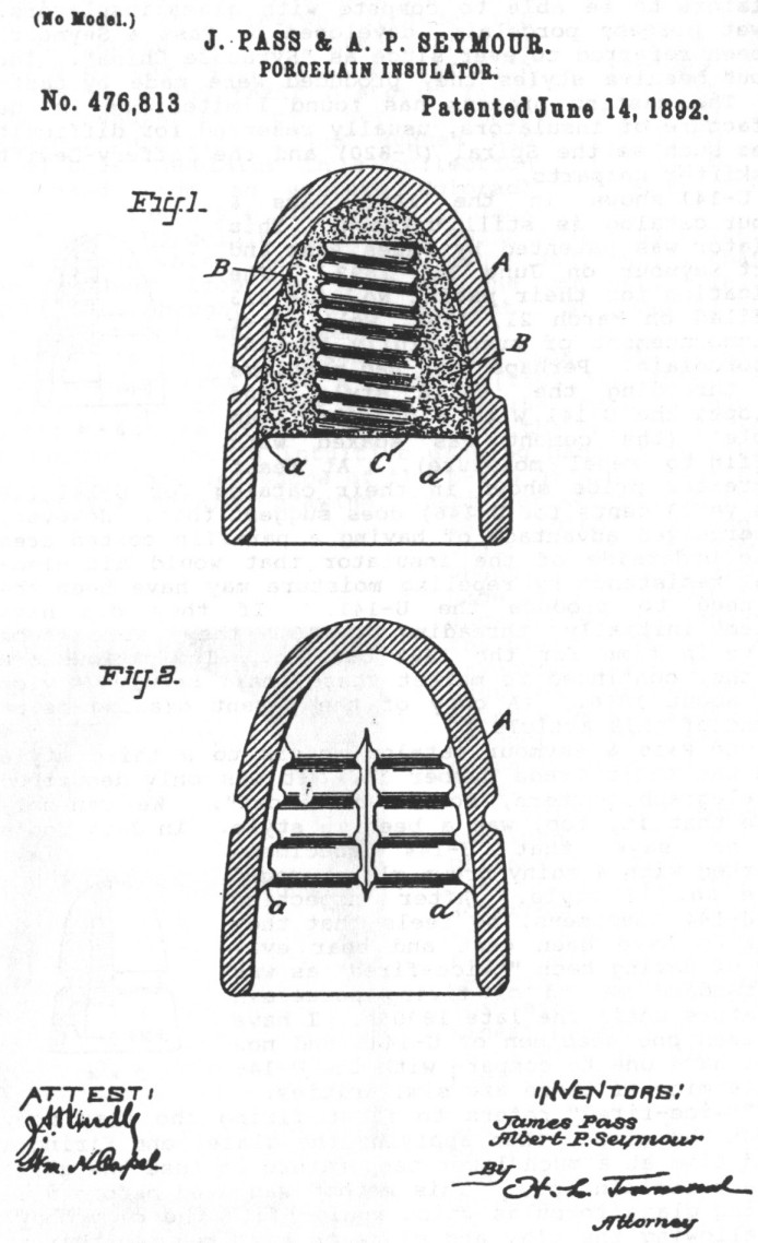 This insulator was patented by James Pass and Albert Seymour on June 14, 1892.