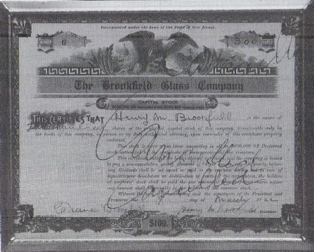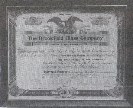 issued to the Brookfield Glass Company for 100 shares at $100 each, dated the