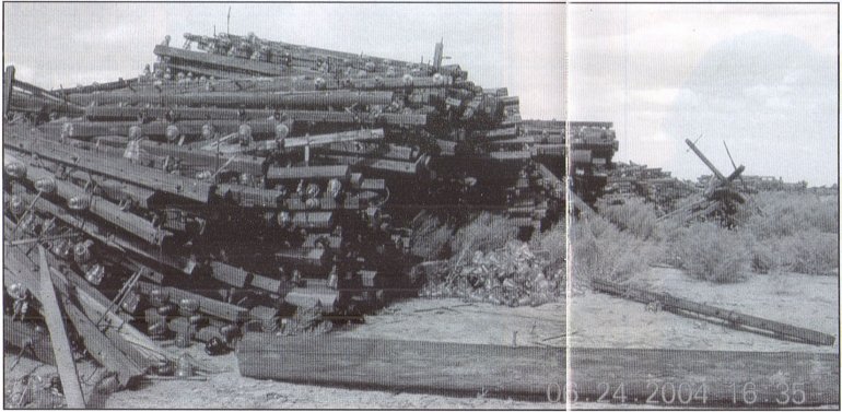 Piles of cross arms loaded with insulators. Located just off a highway in