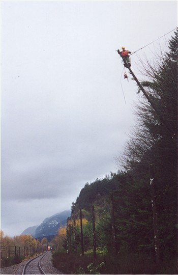 train approaching in the background. Dave climbs the tree to cut the top out of