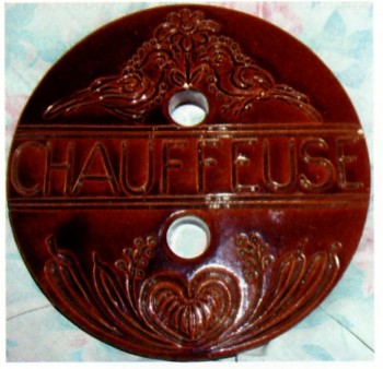 Elton Gish believes these are decorative pottery guide plates through which wires passed as they went into buildings (and into wall tubes). The Chauffeuse shown in the 1998 article was
